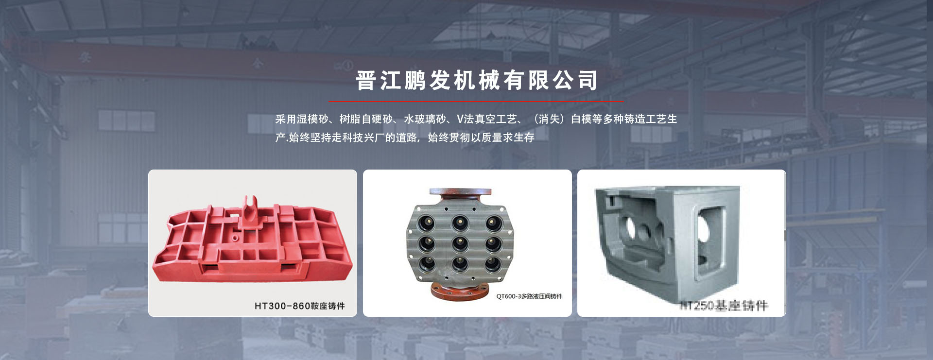 鵬發機械鑄造生產鞋機、大圓針織機、液壓機、數控機床、CNC加工中心配件。鵬發機械鑄造采用濕模砂、樹脂自硬砂、水玻璃砂、V法真空工藝、(消失)白模等多種鑄造工藝生產。鑄件材質有:多種牌號灰口鑄鐵、多種牌號球墨鑄鐵、鑄鋼件,同時也生產低合金鋼、高錳鋼等材質鑄件。員工120人,其中技術人員12人。具有雄厚的技術力量、先進的檢測儀器及完善的管理體系?,F有設備:2T中頻感應電爐3套6爐,雙臂樹脂自硬混砂機3套,S114混砂機3套,V法真空鑄造生產線造型工作臺6站,拋丸、水力清理鑄件5套,退火設備1條,爐前鐵液質量管理儀,高頻紅外碳硫分析儀,微機高速分析儀,熔煉測溫儀,布氏、洛氏硬度計,金相、拉力試驗機,光譜儀等生產、檢測設備齊全。